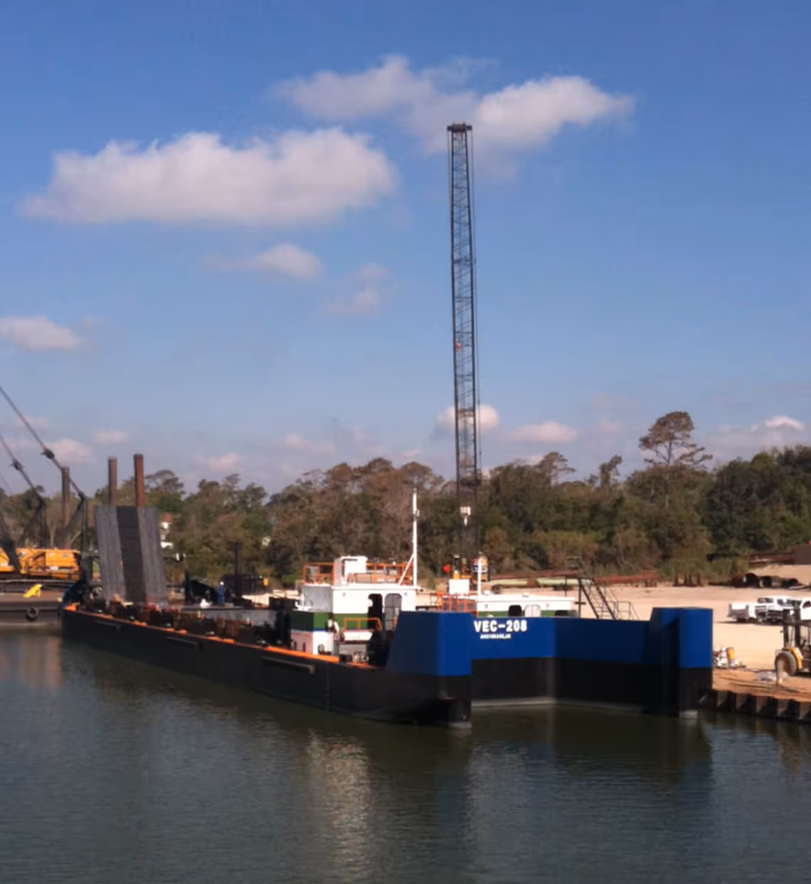 A heavy-duty deck barge supporting inland and river operations with versatile cargo and ramp capabilities.